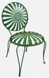Several styles of chairs were tried (and failed) in the 1970s, until Wisco Industries of Oregon, Wisconsin, was contracted in 1981 to produce the current stamped metal sunburst style. It remains a popular choice for its durability and its ability to stay relatively level on the uneven stones that pave the Terrace, due to the partial hoop connecting the legs. Most chairs made today last for 20 years or longer, and are repainted the signature yellow, “John Deere” green or “Allis Chalmers” orange approximately every five years.