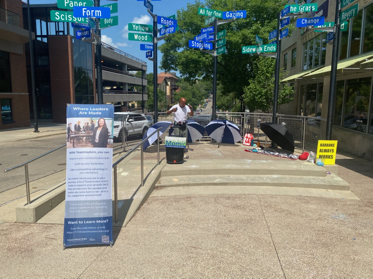 Since September 4, 2022, Kristine Marie Gallagher ’91, MA’94, known in the comic community as “MOMic,” has, along with her daughter, Amanda Benin Gallagher, cohosted and produced an open mic outside the Madison Children’s Museum during the Dane County Farmers’ Market. They invite and sometimes entice passersby to try karaoke. What has happened as a result has been sweet, silly, and actually incredible! Like last KAW, as it’s called: a woman, after belting out several numbers told the story of how she lost her two-year-old son through a tragic accident. Embracing strangers and amplifying voices is what it’s all about.