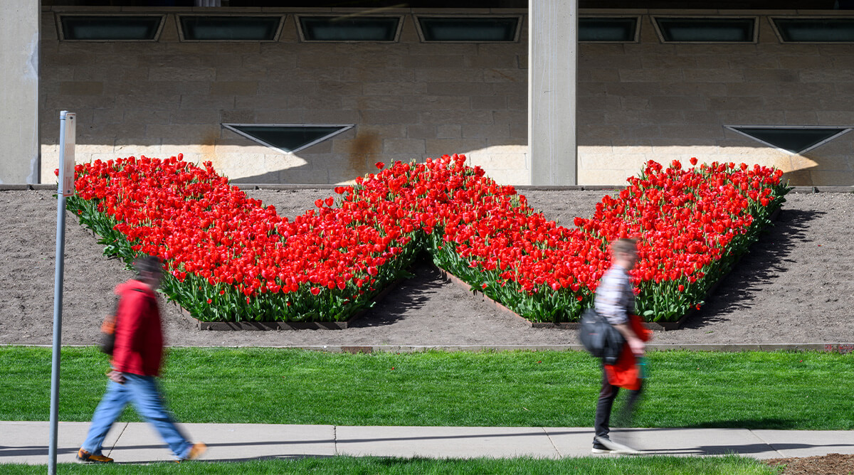 Black-eyed Susans and pansies and tulips, oh my! Flowers are abundant on UW–Madison’s campus, but there isn’t one variety that appears more often than others. In fact, when choosing what to plant on campus, variety is the name of the game. Each year, the UW’s greenhouse team and the Division of Facilities Planning and Management’s Physical Plant grow more than 30,000 annuals. If you want to see the largest mass of flowers on campus, head over to the Humanities Building in the summer. There, you’ll find one of campus’s most eye-catching Ws on display: a red-and-white floral arrangement of begonias or vinca, depending on the year. From pansies, violas, and snapdragons in the spring to assorted bulbs and mums in the fall, each bloom is chosen for its beauty and utility. A diverse selection of site-appropriate trees, shrubs, perennials, and annuals not only enhances campus’s aesthetic appeal, but it also supports ongoing biodiversity efforts. In addition to their annual plantings, several campus groups have collaborated with Physical Plant and the grounds crew to create specialized, low-mow pollinator habitats to attract and sustain bees and butterflies and to employ sustainable practices such as using organic fertilizers and implementing water-conservation methods. Though you won’t find a plethora of one type of petal, you will find an assortment of vibrant blooms that contribute to an equally beautiful and biodiverse campus environment.