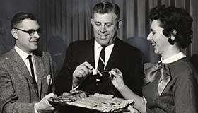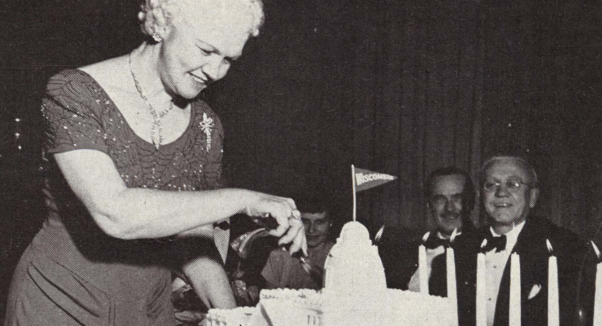 The broadcast in 1949 started four days of celebration in honor of the university’s 100th birthday, culminating in a dinner and dancing at Memorial Union on February 8. Alumni and friends were amazed to find Wisconsin’s First Lady, Mary Fowler Rennebohm ’20, cutting a 60-pound cake in the shape of a frosted Bascom Hall, measuring six feet wide and more than a foot tall. New head football coach Ivan “Ivy” Williamson spoke to the capacity crowd, and students performed a skit built around the 1850 inauguration of the UW’s first chancellor, John Lathrop.