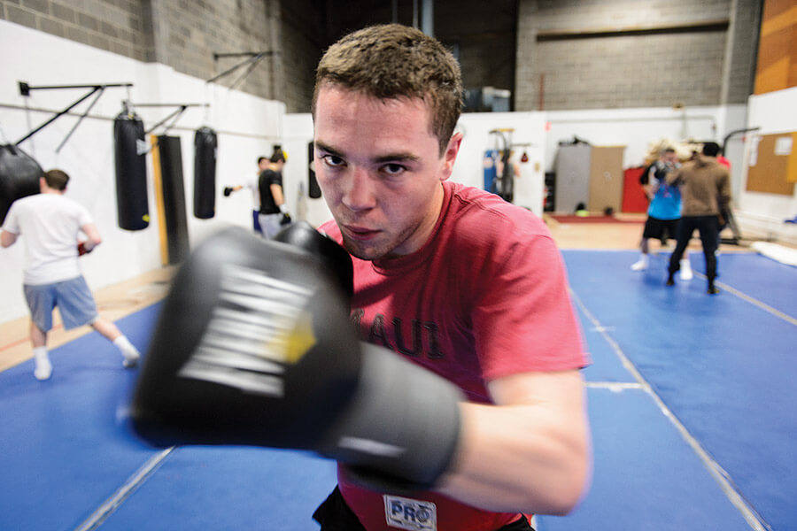After investigating in the university’s archives, Chandler realized the 1960 intercollegiate ban did not technically extend to club sports. Chandler says that thanks to Lynch’s insights about the reaction to Mohr’s death, he and a couple of other students were able to develop a proposal for a club that emphasized self-defense and exercise — much like a martial-arts club — instead of competitive fighting. After almost a year of petitions, paperwork, and presentations, Chandler won approval from the Division of Recreational Sports in December 2013.