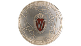 Made from a domed, fine silver disk set with a sterling silver backing, the Forward under 40 award (above) contains the UW crest set within the state of Wisconsin and superimposed on an image of a globe. The crest is enameled with red transparent glass, allowing light to enter and reflect back toward the viewer, and the award winners’ names are engraved on the back of the medallions.
